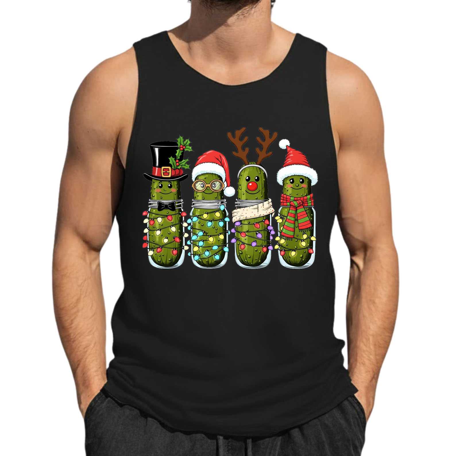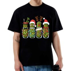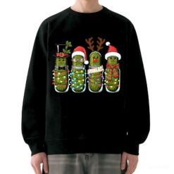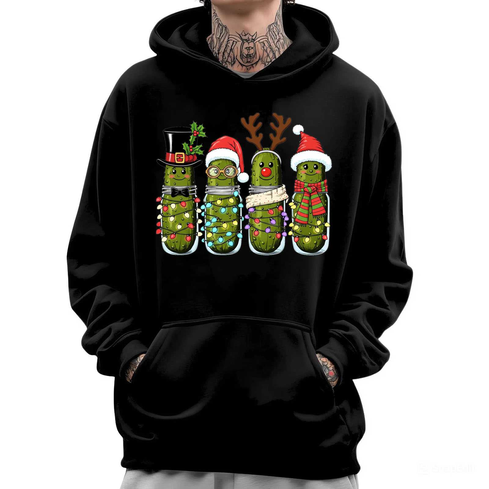 You'll be ready to relish the holiday season with this uniquely hilarious Festive Pickle Quartet Sweatshirt - Getting Lit Christmas Gift! This cozy black crewneck features four cartoon pickles, each nestled snugly in a jar and playfully "getting lit" by being tangled up in colorful Christmas string lights. Our cheerful quartet is fully decked out for the holidays, sporting different festive accessories like Santa hats, reindeer antlers, a top hat, and cozy scarves. More than just a piece of apparel, this sweatshirt is a fantastic conversation starter and makes the ultimate funny and quirky Christmas gift for anyone who loves non-traditional holiday humor or is a fan of the traditional Christmas Pickle ornament