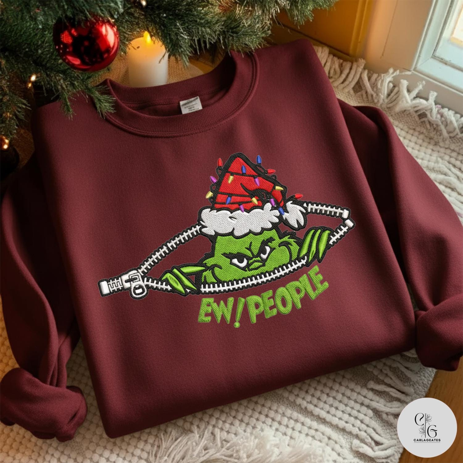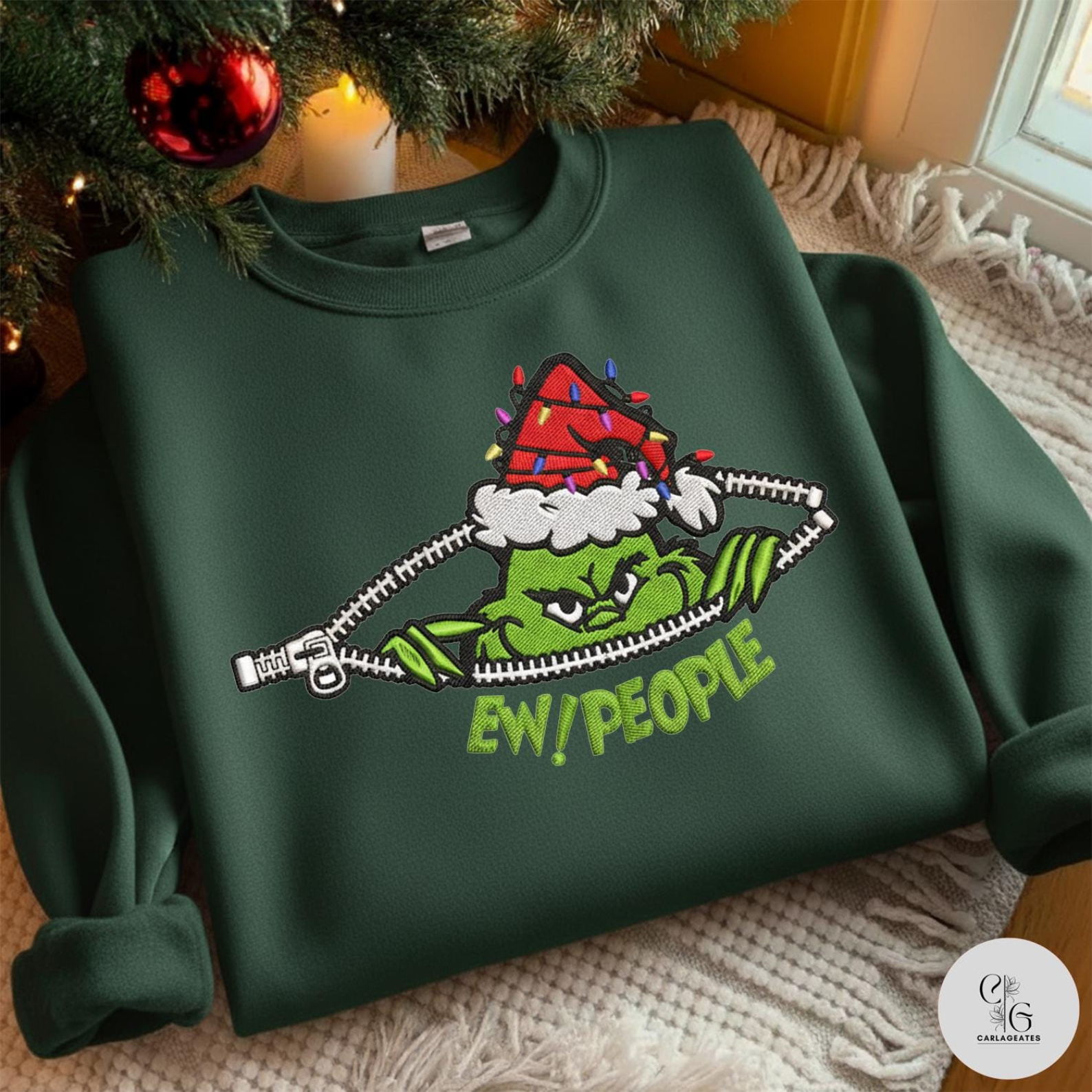 Product Information "Grinch Zipper Ew People Embroidered Design - Anti Social Christmas Sweatshirt"