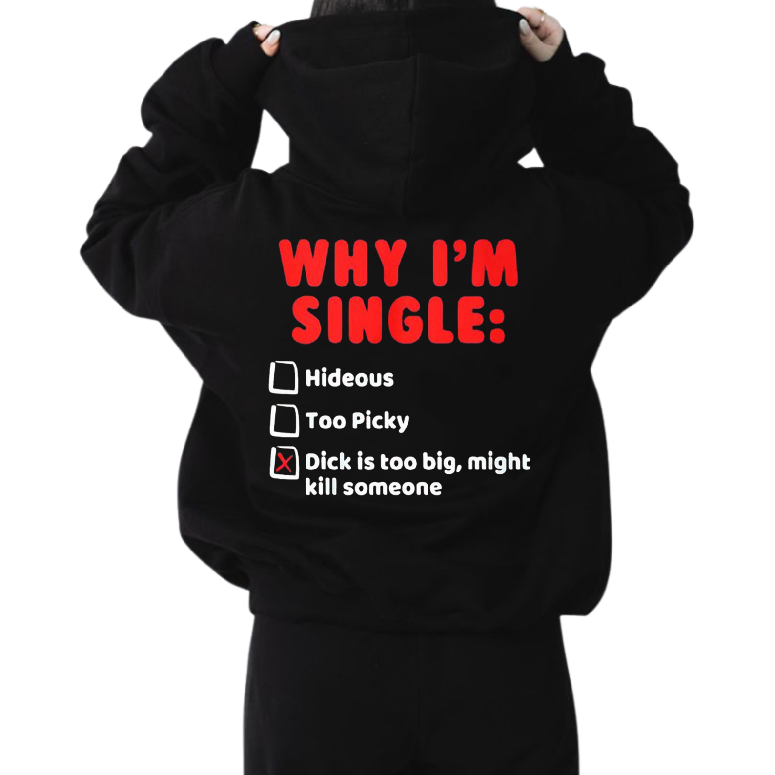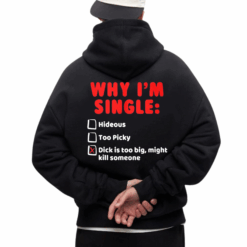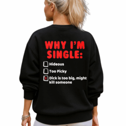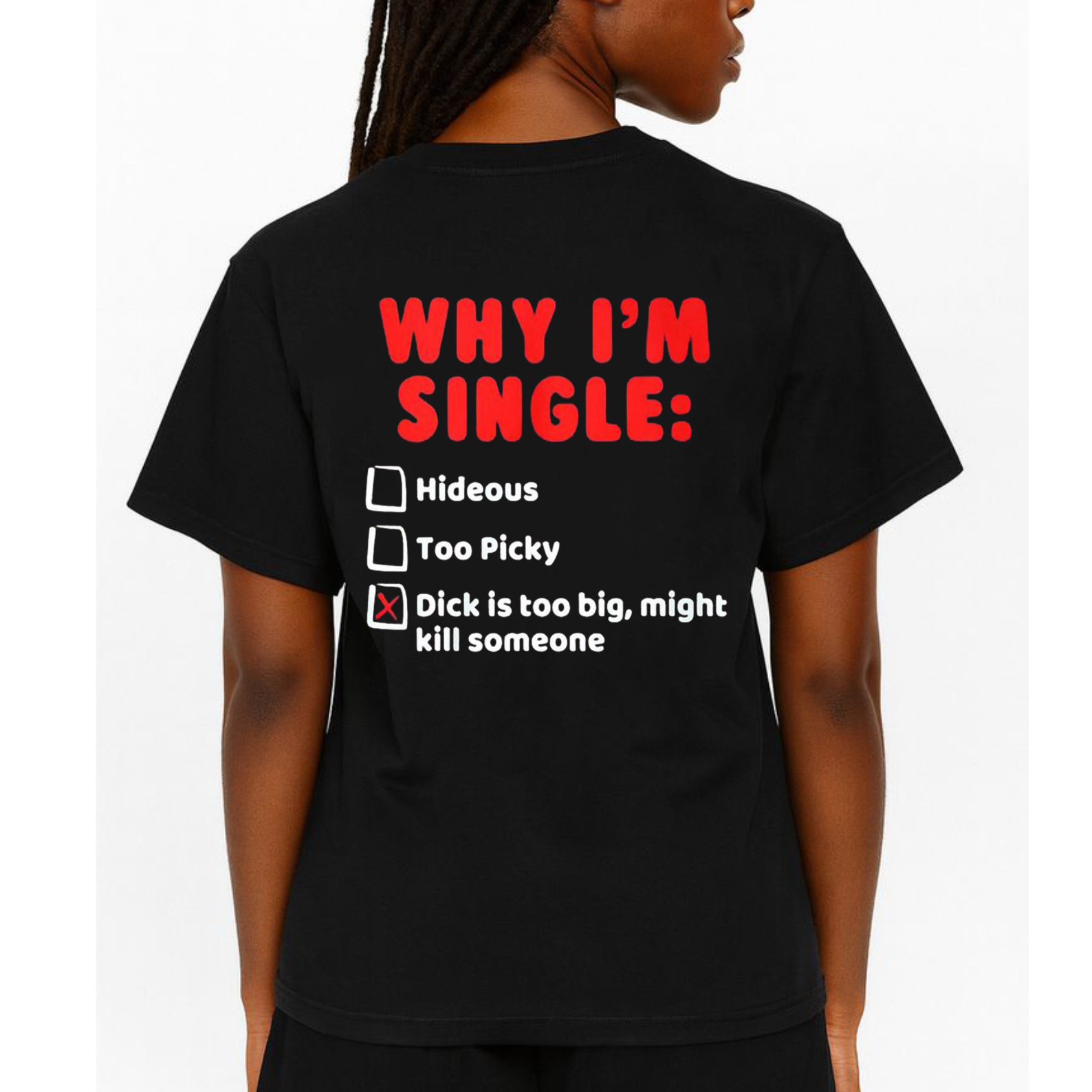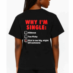 Make a bold and humorous (and slightly inappropriate) statement with this funny graphic tee! The back of the shirt features the confident declaration "WHY I'M SINGLE:" followed by a checklist with the highlighted reason: "Dick is too big, might kill someone." This black t-shirt is designed for those with a confident personality and a cheeky sense of humor, making it an ideal choice for bachelor parties, casual outings with friends, or whenever you want to generate some guaranteed laughs (and maybe a few stunned glances).